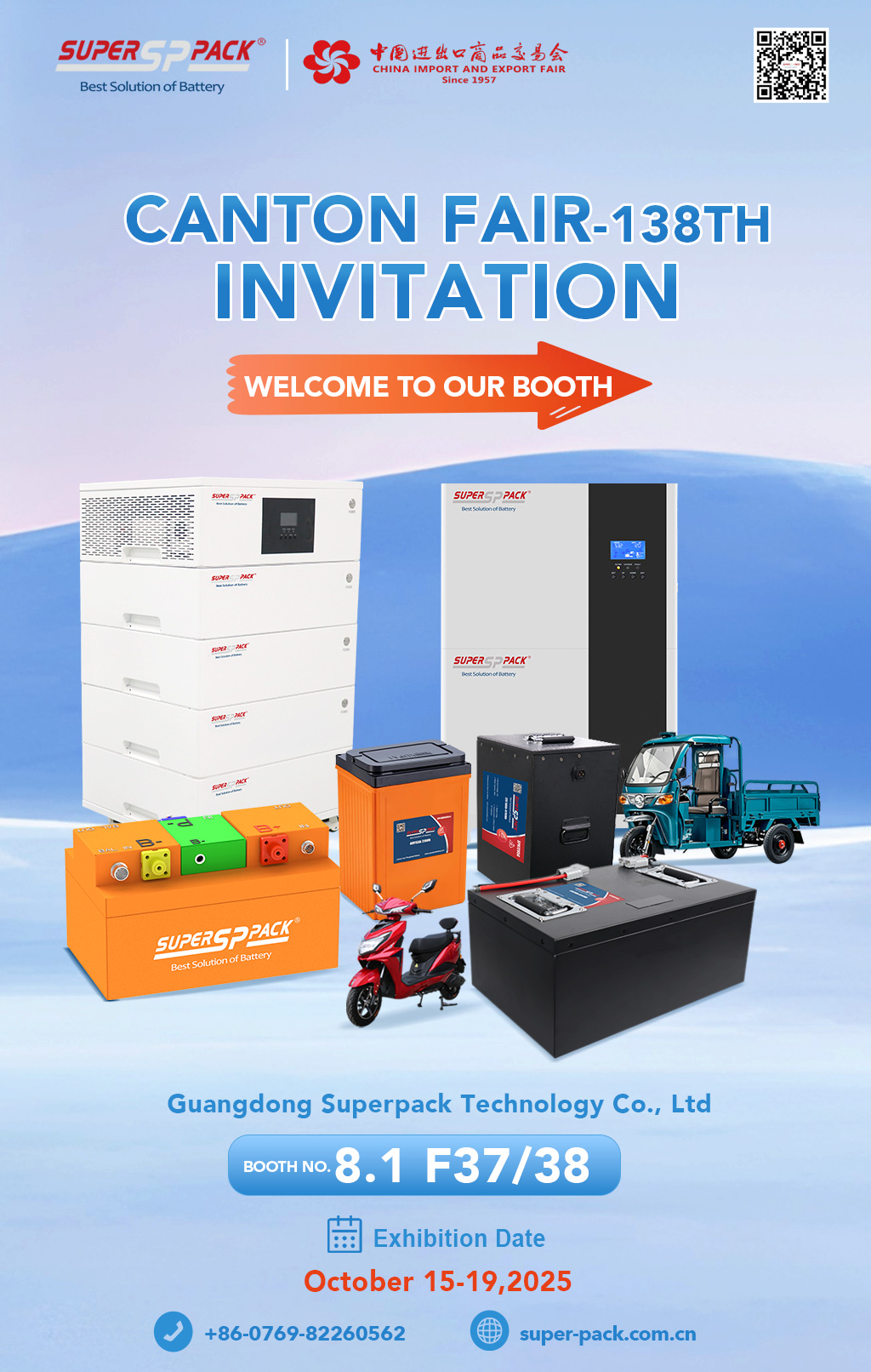 Superpack's a leading provider of advanced battery technology, will showcase its innovative energy solutions at the 138th Canton Fair from October 15-19, 2025. Visit us at Booth 8.1 F37-38 to discover our latest products across three key segments: high-performance batteries for two-wheelers and three-wheelers, and intelligent home energy storage systems. Our experts will be on hand to discuss global business opportunities and how our reliable, sustainable power can drive your business forward.